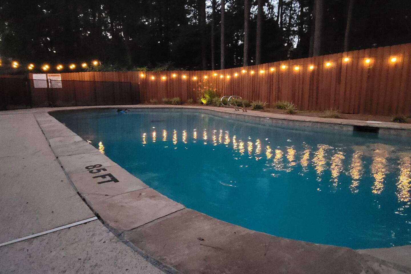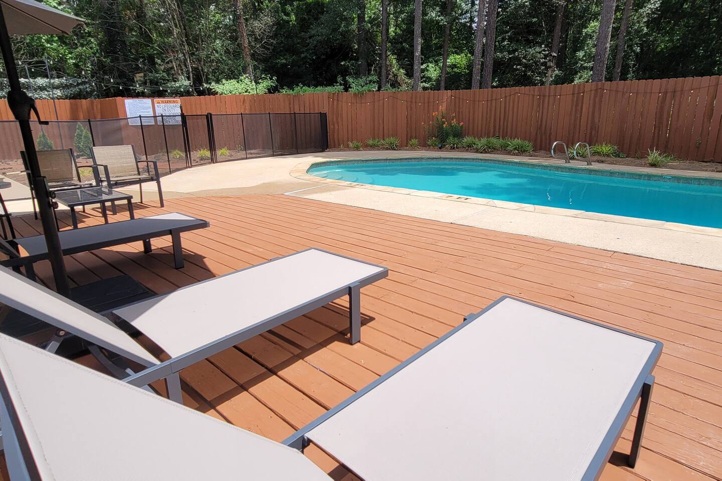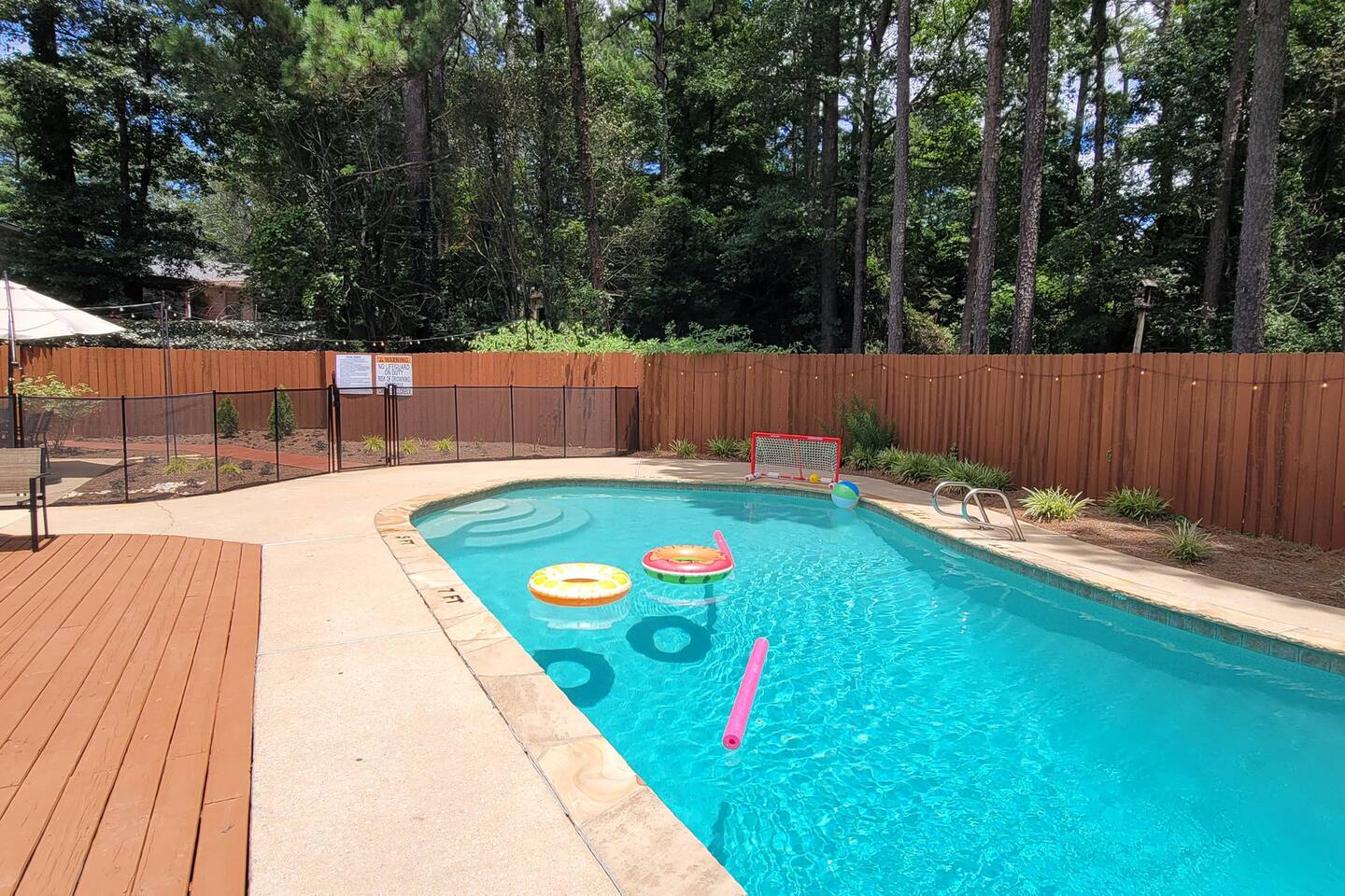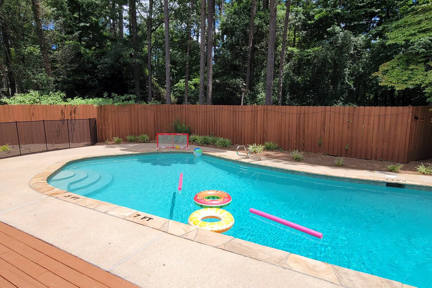 Our home features: - **Private Pool:** Enjoy a refreshing dip in your own deep private pool, ideal for cooling off on warm days and quality family time. (Seasonal April-October) - **Outdoor Space:** A lovely backyard with seating, perfect for morning coffee or evening drinks. Plus, a cornhole game for fun competition! - **Outdoor Grill:** A convenient poolside gas grill, perfect for barbecues and outdoor dining. - **Cozy Living Area:** A comfortable living room, a big-screen smart TV, and a real wood-burning fireplace, perfect for movie nights. Board games are also available for family fun :) - **Fully-Equipped Kitchen:** A modern kitchen with all essentials for preparing delicious meals, along with a variety of coffee and tea choices. - **3 Bedrooms:** Comfortable and cozy, ensuring a restful night's sleep for up to 6 guests. An extra queen-size air mattress is available for 2 additional guests. - **Massive Driveway:** A large driveway that can fit up to 5 cars, perfect for bringing your boat! **Nearby Attractions:** Centrally located to many attractions, including: - Margaritaville at Lanier Islands - Sugarhill E-center - Suwanee Town Center - Mall of Georgia - Buford Dam Park at Lake Lanier - Numerous family-friendly restaurants and cafes