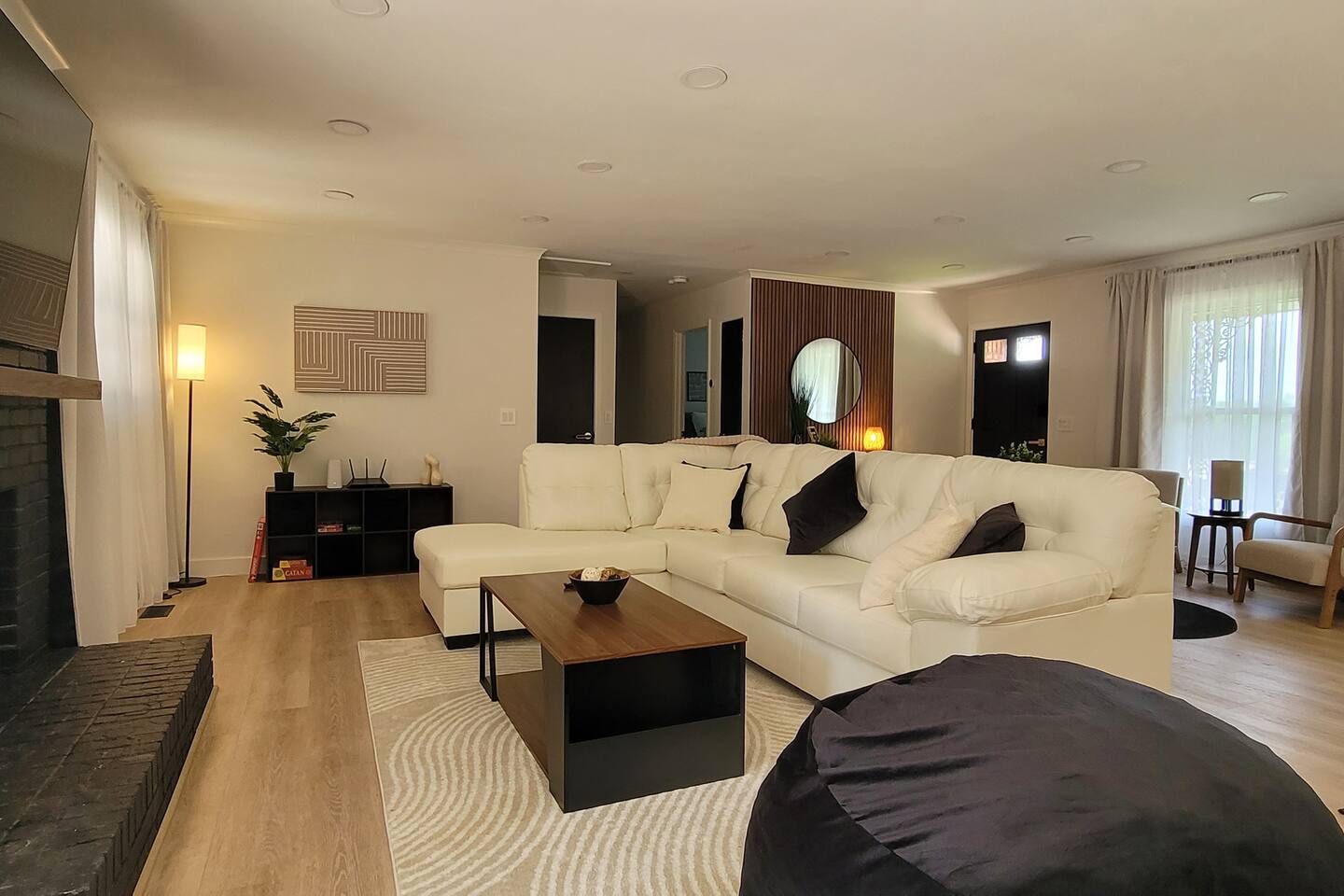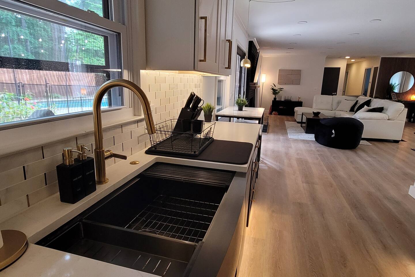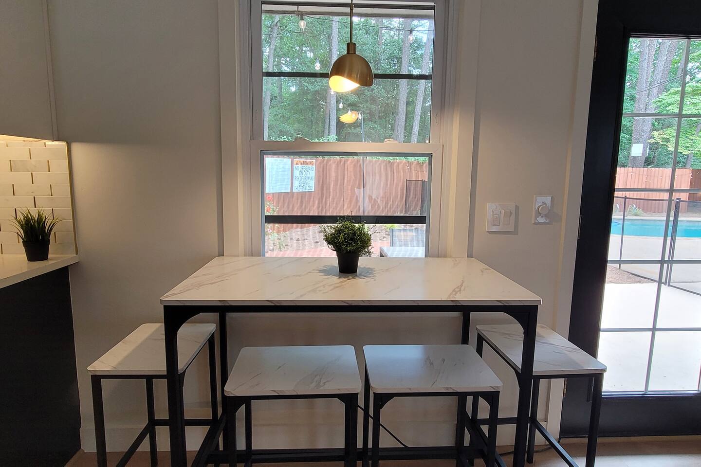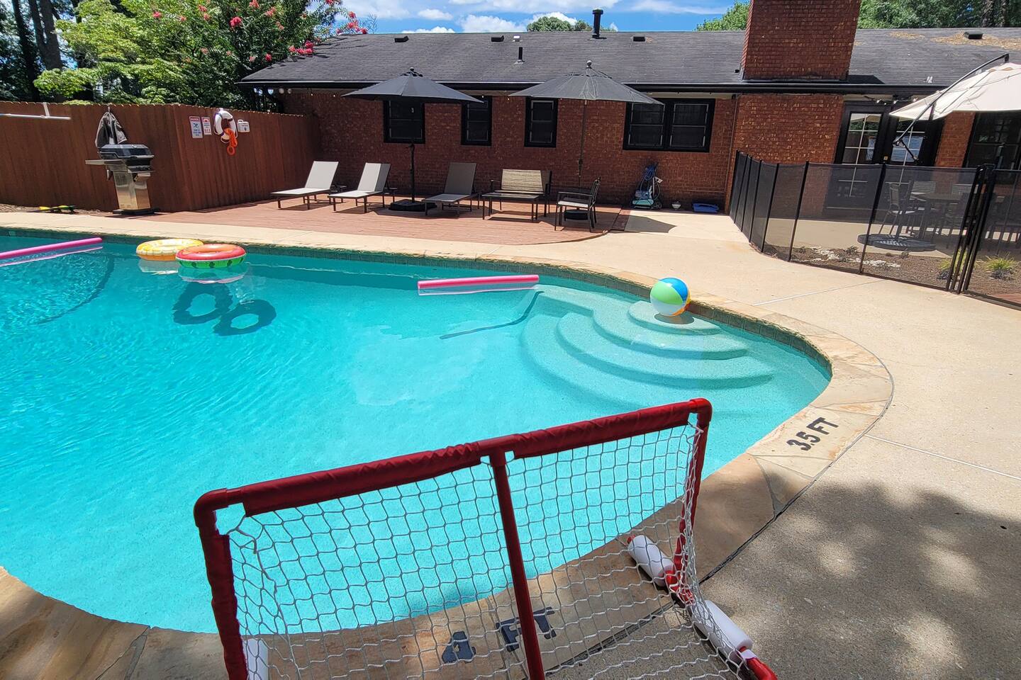 Our home features: - **Private Pool:** Enjoy a refreshing dip in your own deep private pool, ideal for cooling off on warm days and quality family time. (Seasonal April-October) - **Outdoor Space:** A lovely backyard with seating, perfect for morning coffee or evening drinks. Plus, a cornhole game for fun competition! - **Outdoor Grill:** A convenient poolside gas grill, perfect for barbecues and outdoor dining. - **Cozy Living Area:** A comfortable living room, a big-screen smart TV, and a real wood-burning fireplace, perfect for movie nights. Board games are also available for family fun :) - **Fully-Equipped Kitchen:** A modern kitchen with all essentials for preparing delicious meals, along with a variety of coffee and tea choices. - **3 Bedrooms:** Comfortable and cozy, ensuring a restful night's sleep for up to 6 guests. An extra queen-size air mattress is available for 2 additional guests. - **Massive Driveway:** A large driveway that can fit up to 5 cars, perfect for bringing your boat! **Nearby Attractions:** Centrally located to many attractions, including: - Margaritaville at Lanier Islands - Sugarhill E-center - Suwanee Town Center - Mall of Georgia - Buford Dam Park at Lake Lanier - Numerous family-friendly restaurants and cafes